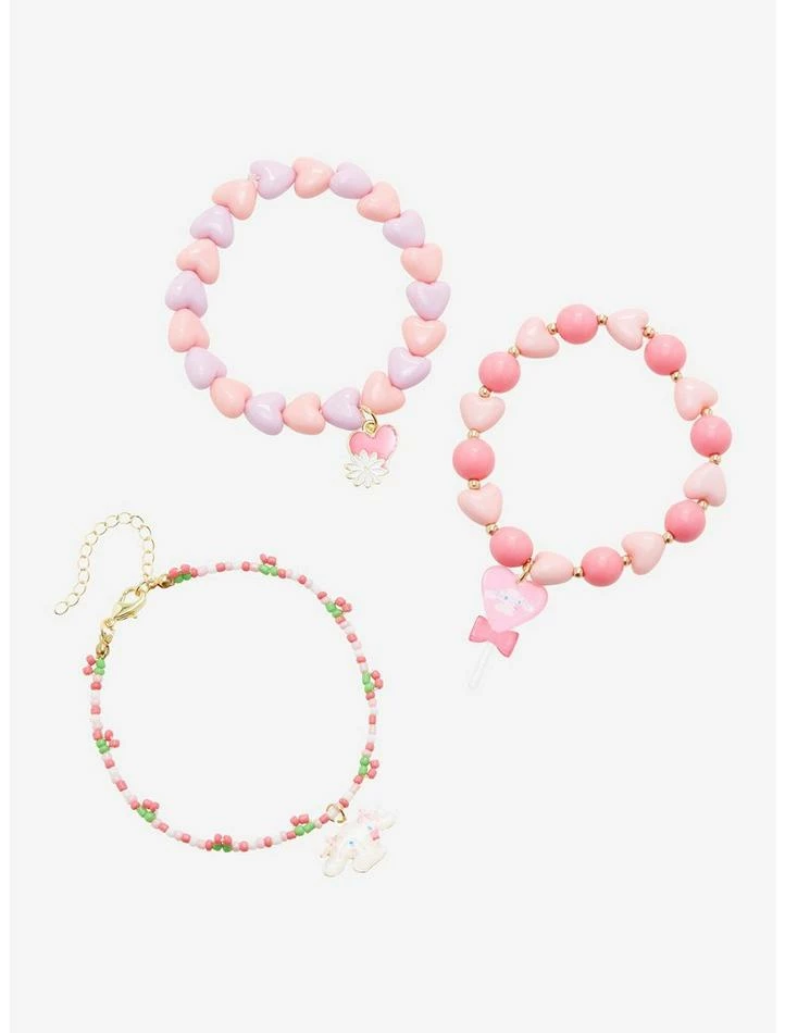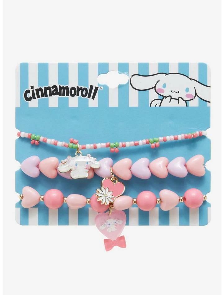 Looking to add something cute to your accessories? Your favorite Sanrio character is here to make you look as sweet as a cinnamon roll! These beaded bracelets feature Cinnamoroll, flower and heart charms matched with micro and colorful pastel heart-shaped beads.