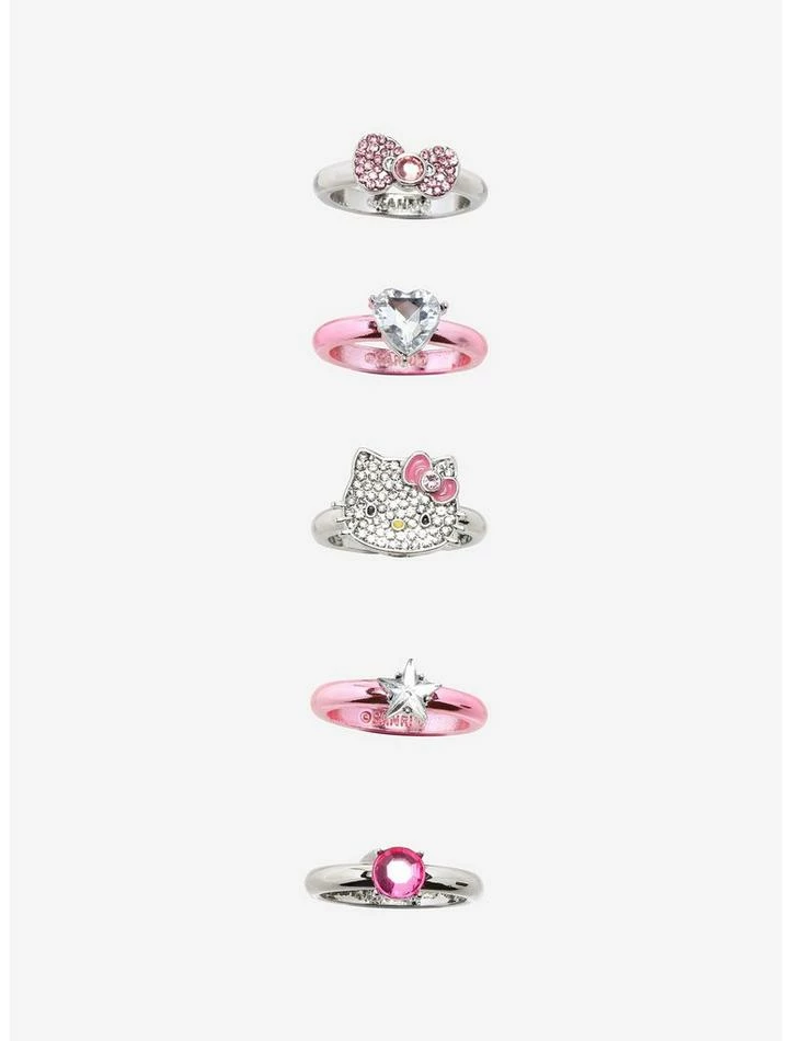 Add some bling to your jewelry collection with the help of Hello Kitty! Walk out in Sanrio style with this pink and silver-tone ring set, featuring bedazzled bow and Hello Kitty charms, plus heart and star faux gem accents.