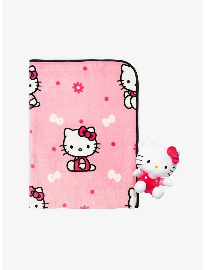 Stay cute and all cuddled up with Hello Kitty! This plush and blanket set will add some Sanrio style to your home. Set comes with a soft blanket with an allover toss of Hello Kitty and bows, plus a matching Hello Kitty plush to cuddle up with!