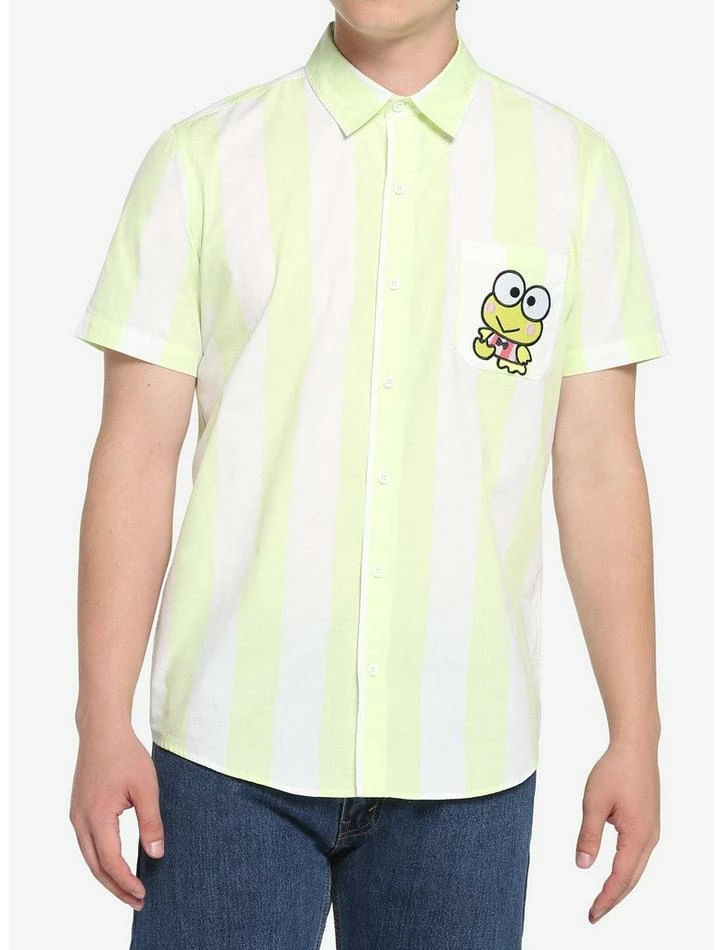 Hop out of the pond and into this woven button-up from Sanrio featuring light green and white vertical straps and an image of Keroppi embroidered on the chest pocket.