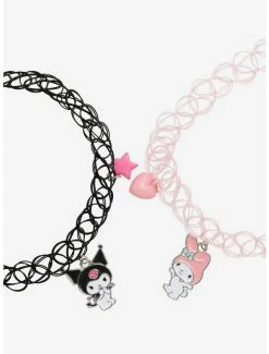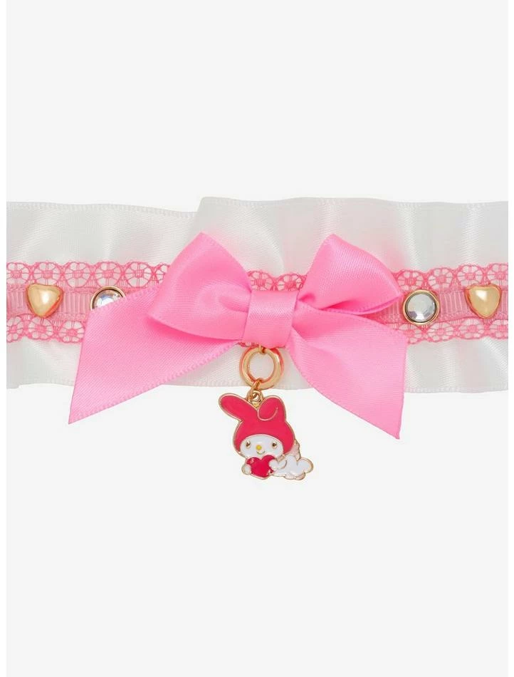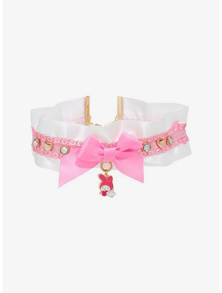 Keep your accessories as sweet as My Melody! This white satin choker will add a kawaii touch to any Sanrio outfit and features a strip of pink lace running through the middle with bejeweled heart and rhinestone charms on the sides, and a central pink bow with a My Melody charm dangling underneath.