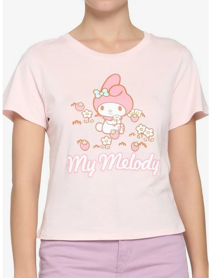 Take a break from baking cookies and enjoy some fresh air with My Melody! This pink baby tee features a print of your favorite Sanrio character sitting outside, surrounded by flowers and strawberries, with “My Melody” below.