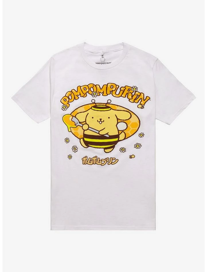 Looking for something sweet to add to your closet? This tee of Pompompurin has us all abuzz! Rep your favorite Sanrio character, featuring Pompompurin in a bumblebee costume and holding a spoonful of honey. His name is printed above and below, with a honeycomb background and daisies sprinkled all over.